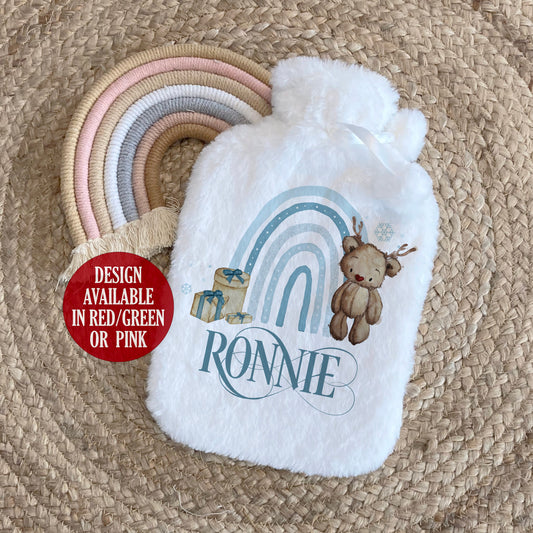 Personalised Hot Water Bottle, Christmas Gift Idea for Her or Him, Cute Rainbow Bear Design, Stocking Filler, Christmas Eve Box Idea
