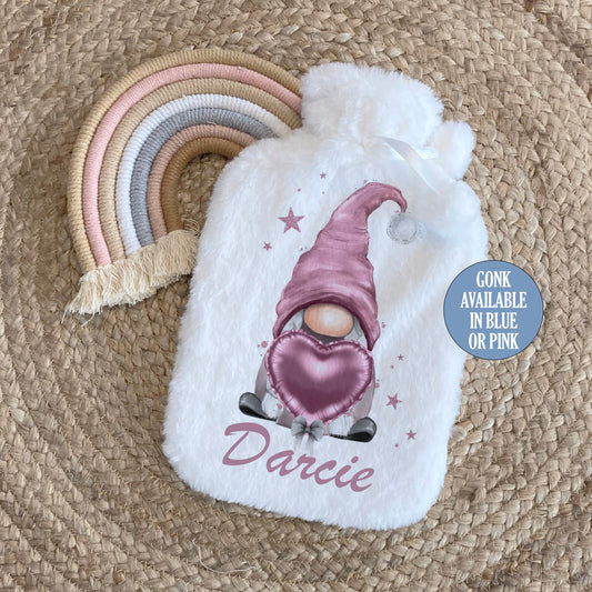 Personalised Gonk Hot Water Bottle, Pink or Blue Available, Gnome Gift Idea for Her and Him, Stocking Filler, Gift Idea for Mum, Nan, Dad