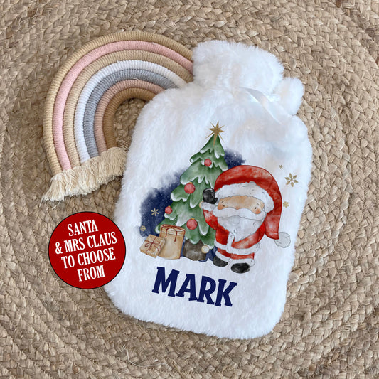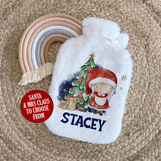 Personalised Hot Water Bottle, Christmas Gift Idea for Her or Him, Mrs Claus and Santa Design, Stocking Filler, Christmas Eve Box Idea