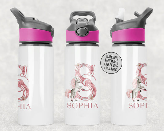 Personalised School Gym Bag, Kids PE Bag, Back to School Unicorn Rose Gold Glitter Letter Alphabet with Name