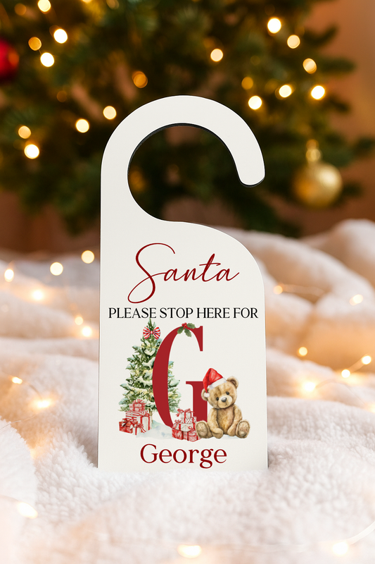 Personalised Santa Please Stop Here Door Hanger - Cute Bear Alphabet