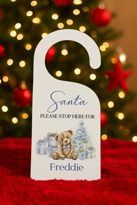 Personalised Santa Please Stop Here Door Hanger - Blue or Pink Bear