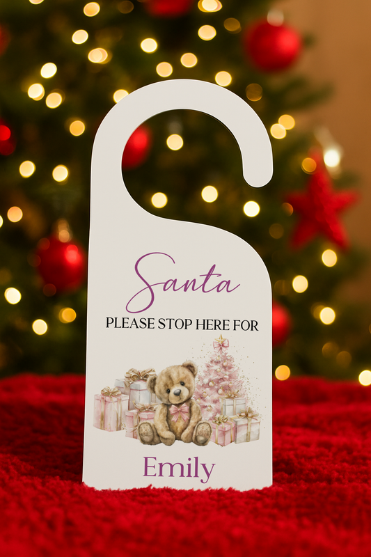 Personalised Santa Please Stop Here Door Hanger - Pink or Blue Bear