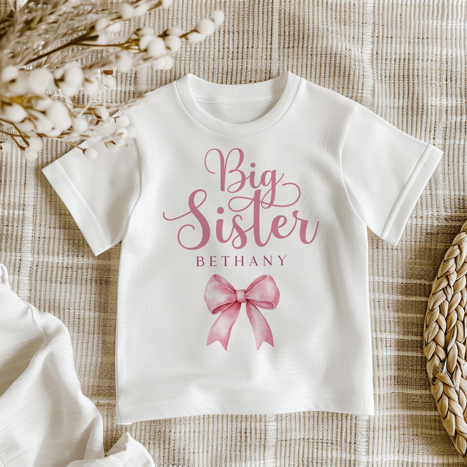 Celebrate your little girl becoming a big sister with our adorable "BIG SISTER" pink bow design t-shirt or sweatshirt. Made from soft and comfortable white cotton, this t-shirt is perfect for announcing the exciting news to family and friends.
