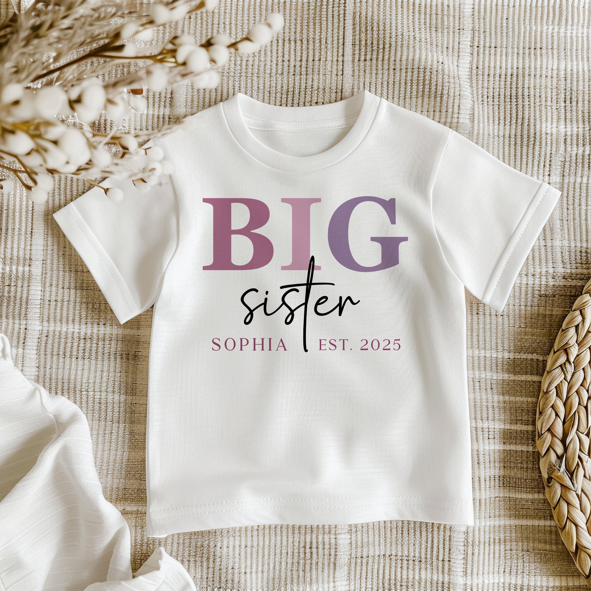 Celebrate your little girl becoming a big sister with our adorable "BIG SISTER" star design t-shirt or sweatshirt. Made from soft and comfortable white cotton, this t-shirt is perfect for announcing the exciting news to family and friends.