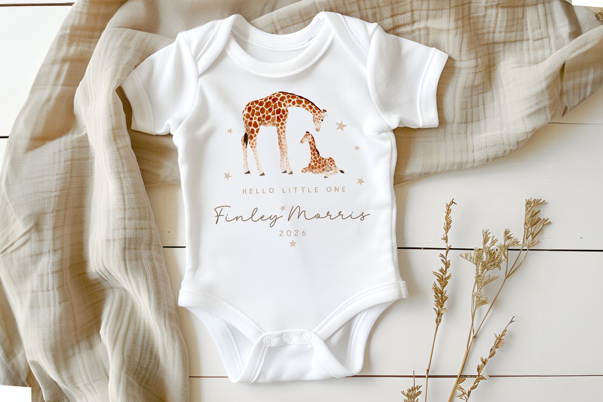 Personalised New Baby Outfit - Beautifully Neutral Colours with Stunning Watercolour Giraffe Design. Perfect for Birth Announcement, Hospital Outfit.