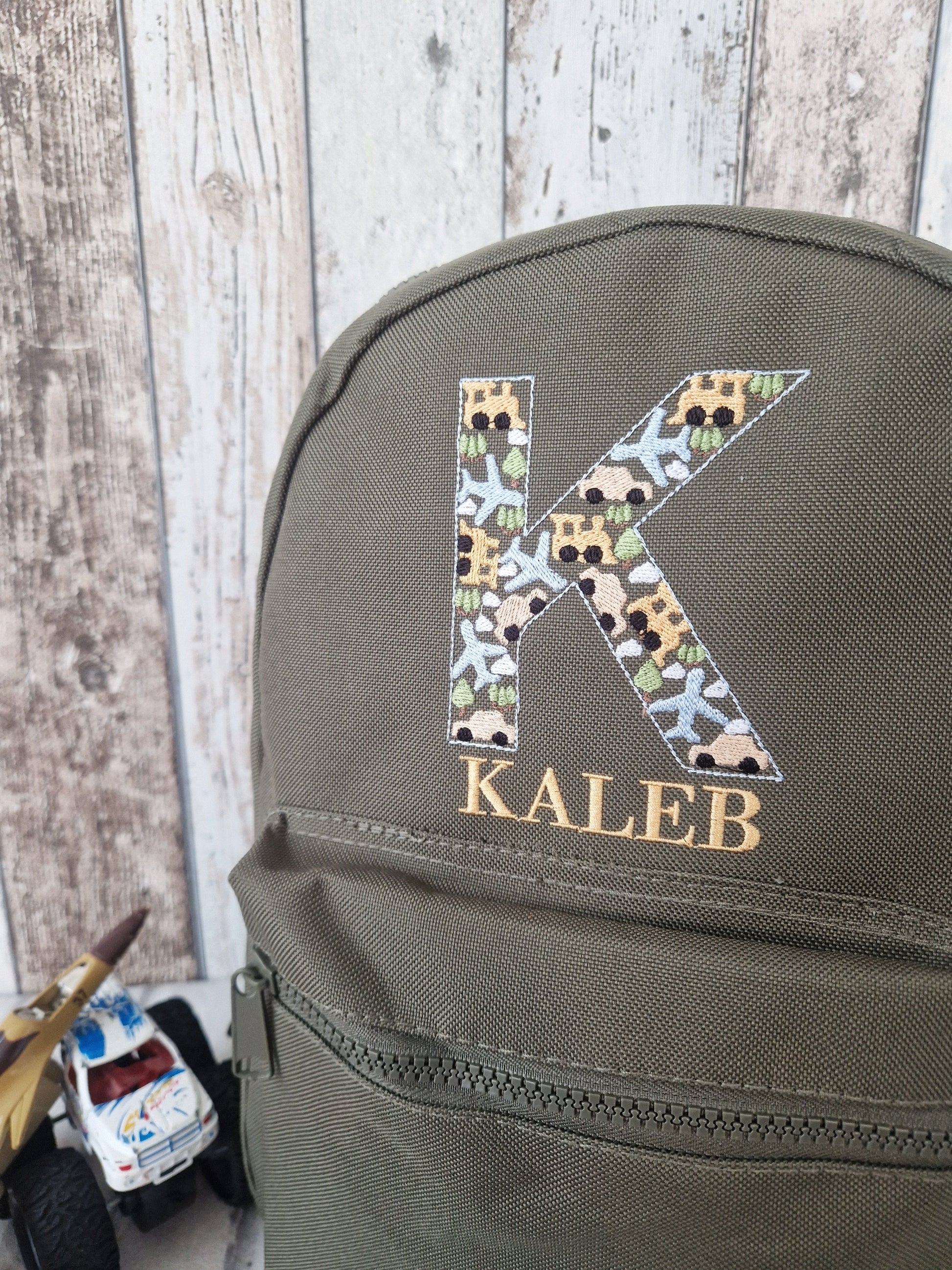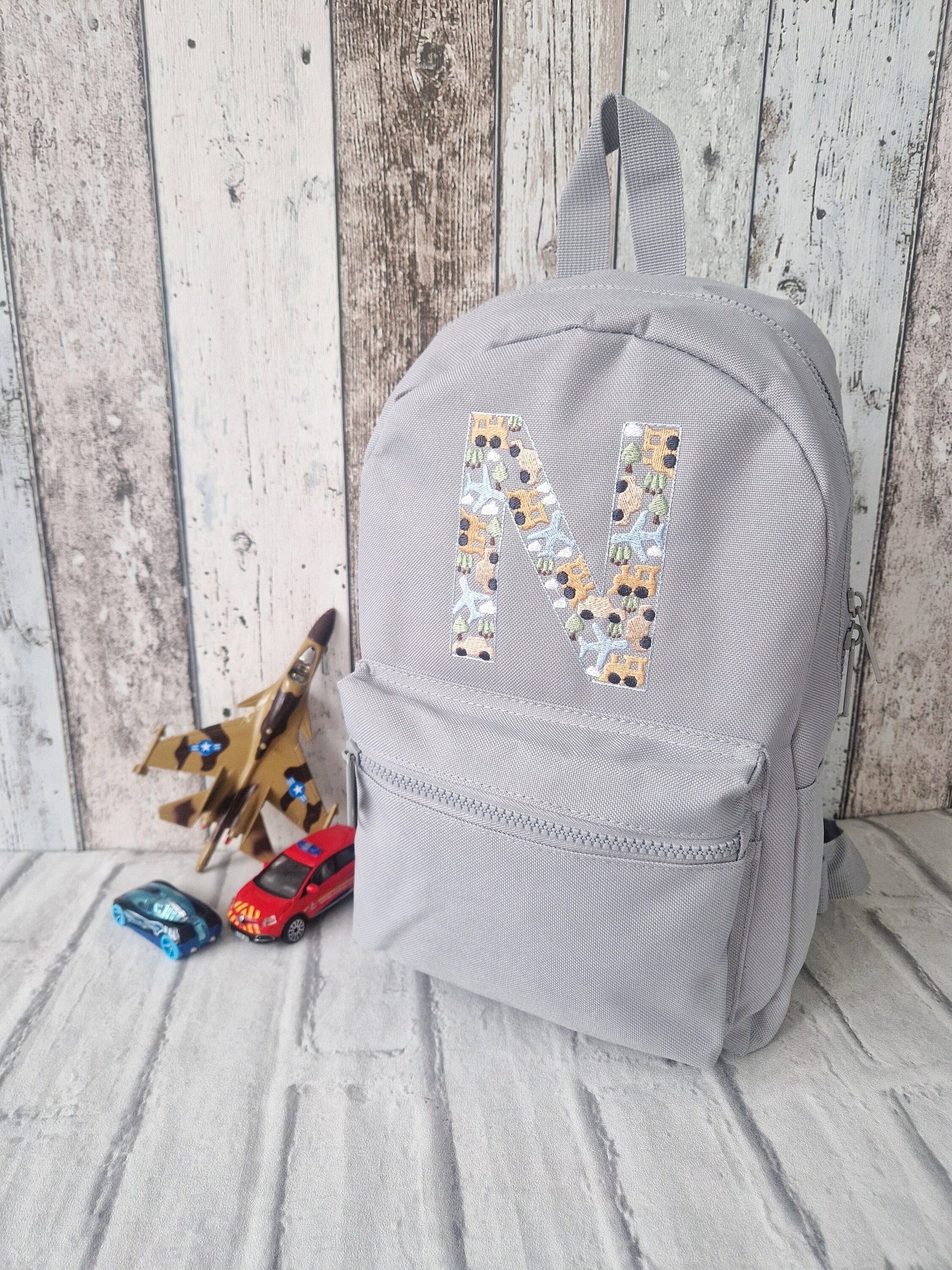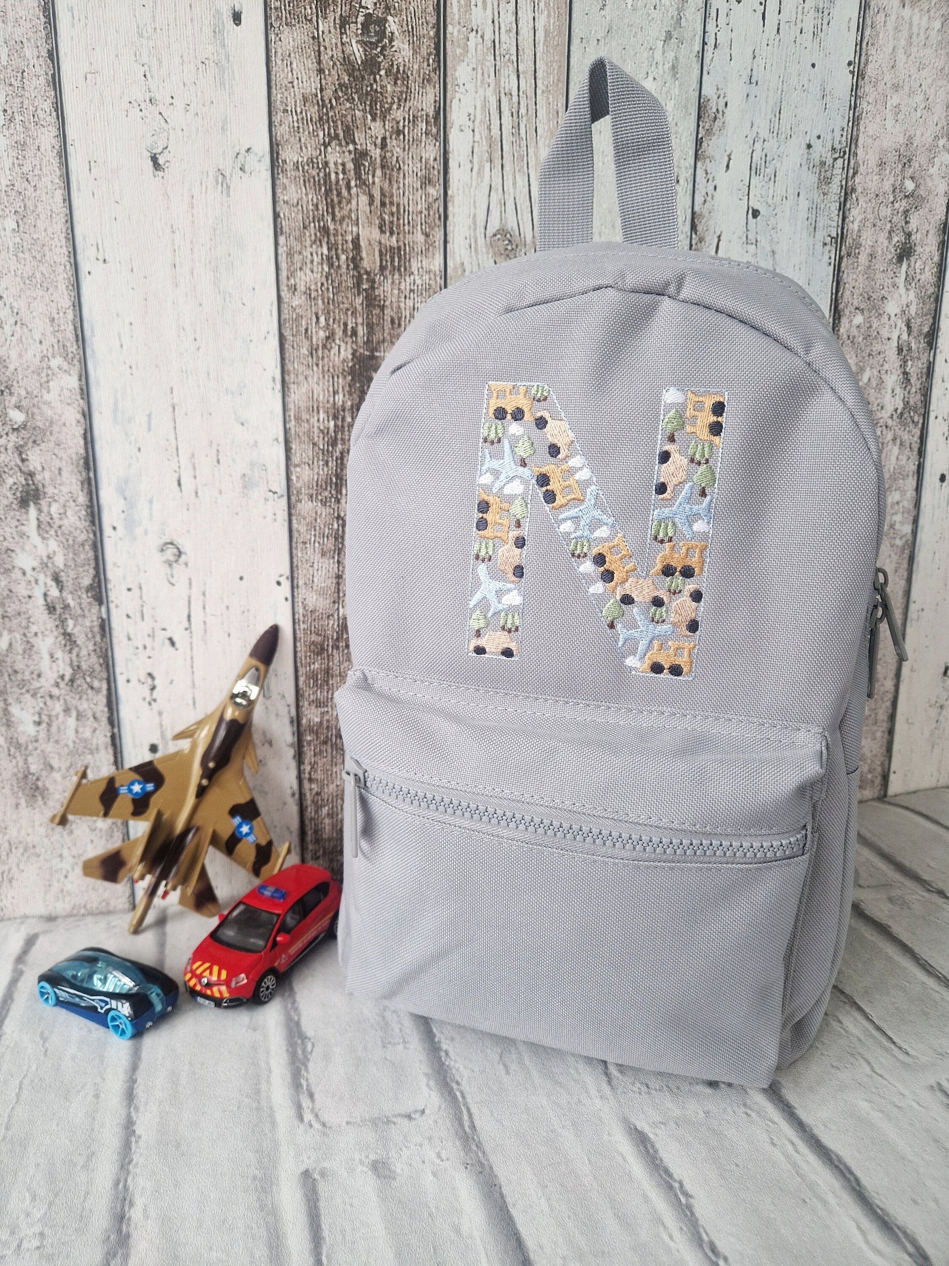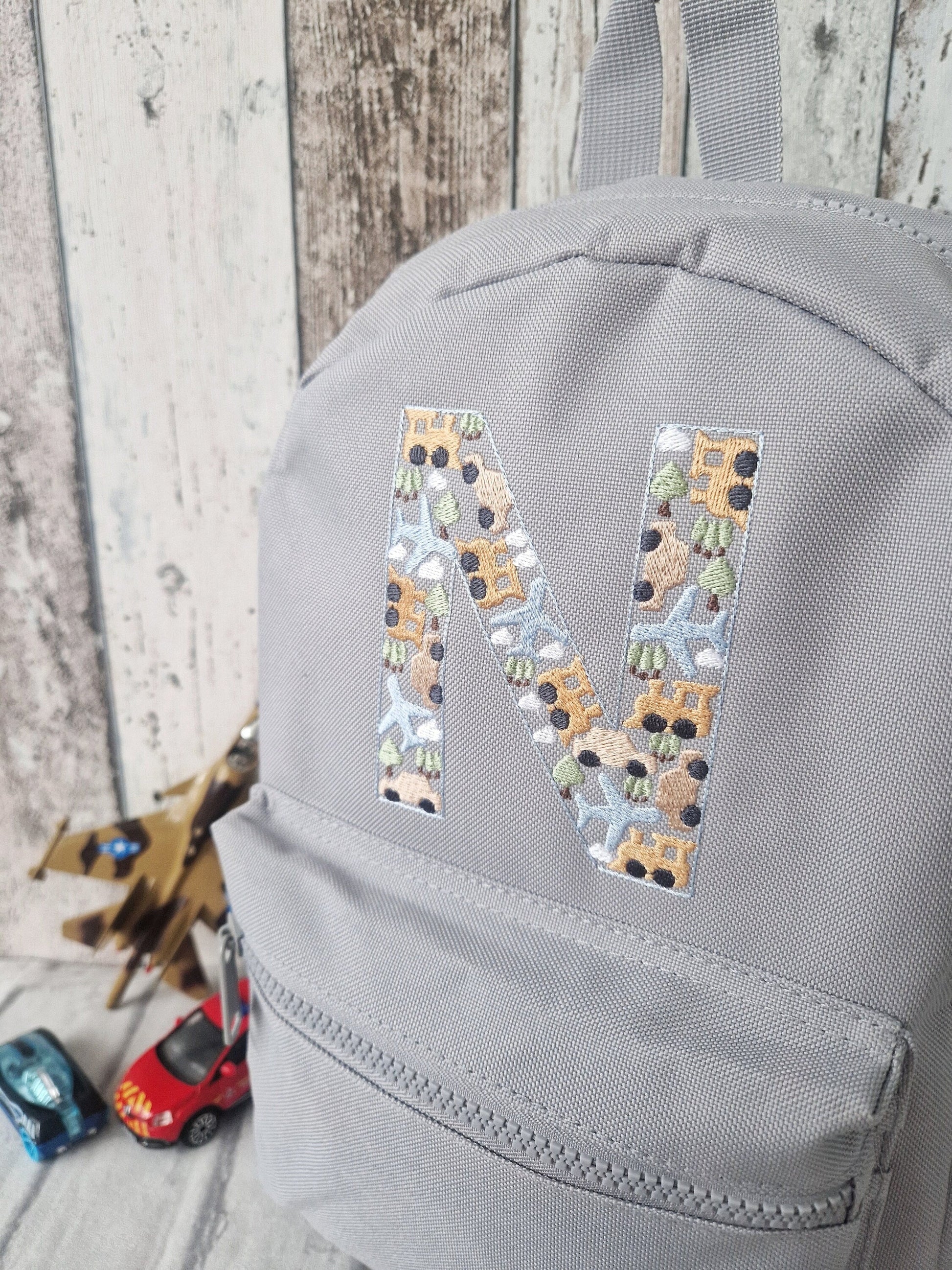 This bag is embroidered with a variation of small transport vehicles, including cars, planes, trains, trees and clouds, carefully placed to form your child's letter initial! Each vehicle is stitched in a different colour thread, making this beautiful design stand out from the crowd!