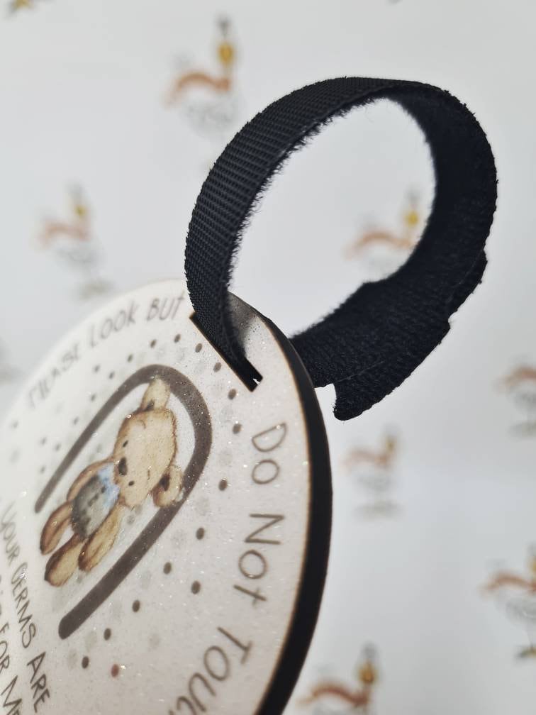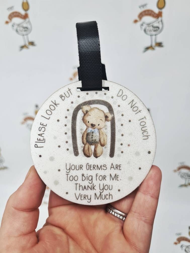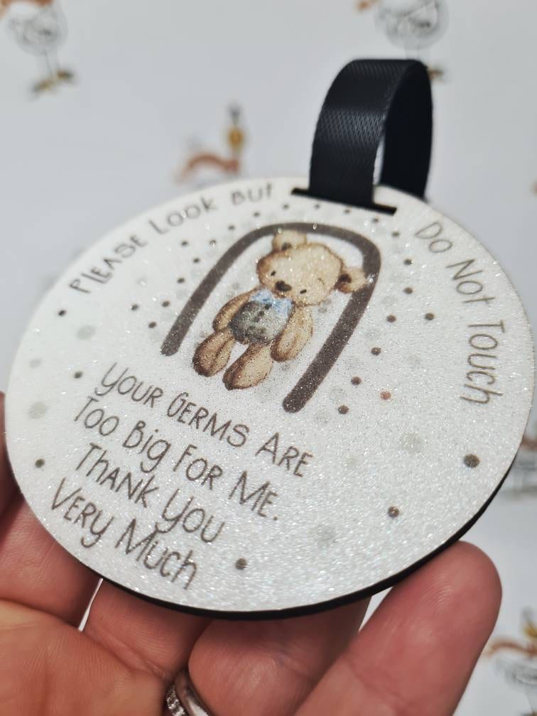 A polite hanging tag to politely request others to not touch your baby - "Please Look But Do Not Touch, Your Germs Are Too Big For Me. Thank You Very Much"