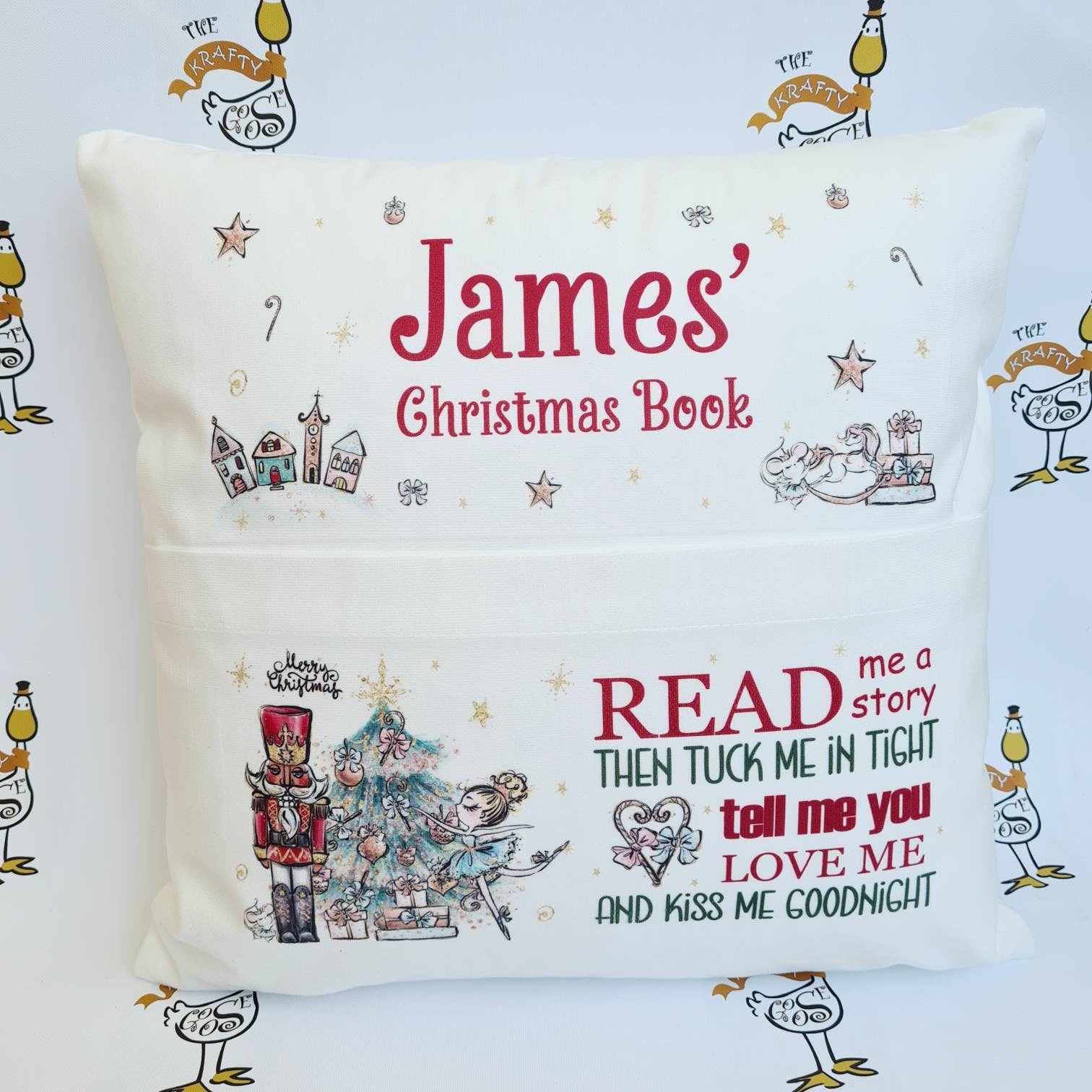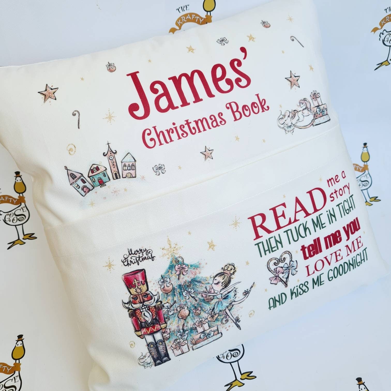 Personalised Christmas Book Cushion, Pocket Cushion, Book Pillow for Children, Christmas Story Time, Nutcracker Santa Elf, Soft Velvet