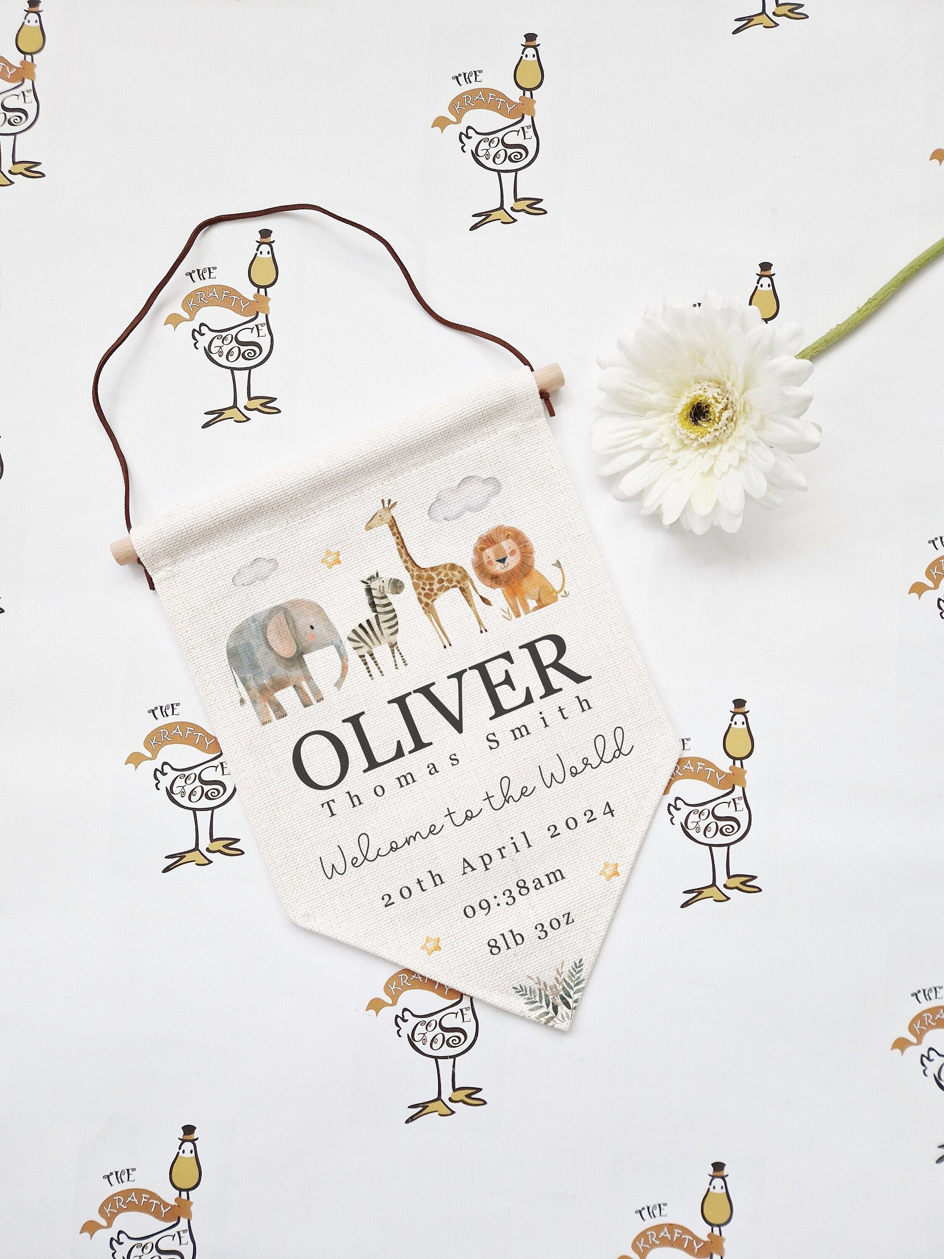 These beautiful linen flags are professionally printed with your baby details, including name, date and time of birth and their birth weight! Featuring these stunning safari animals at the top, this is a gender neutral gift idea for babies.